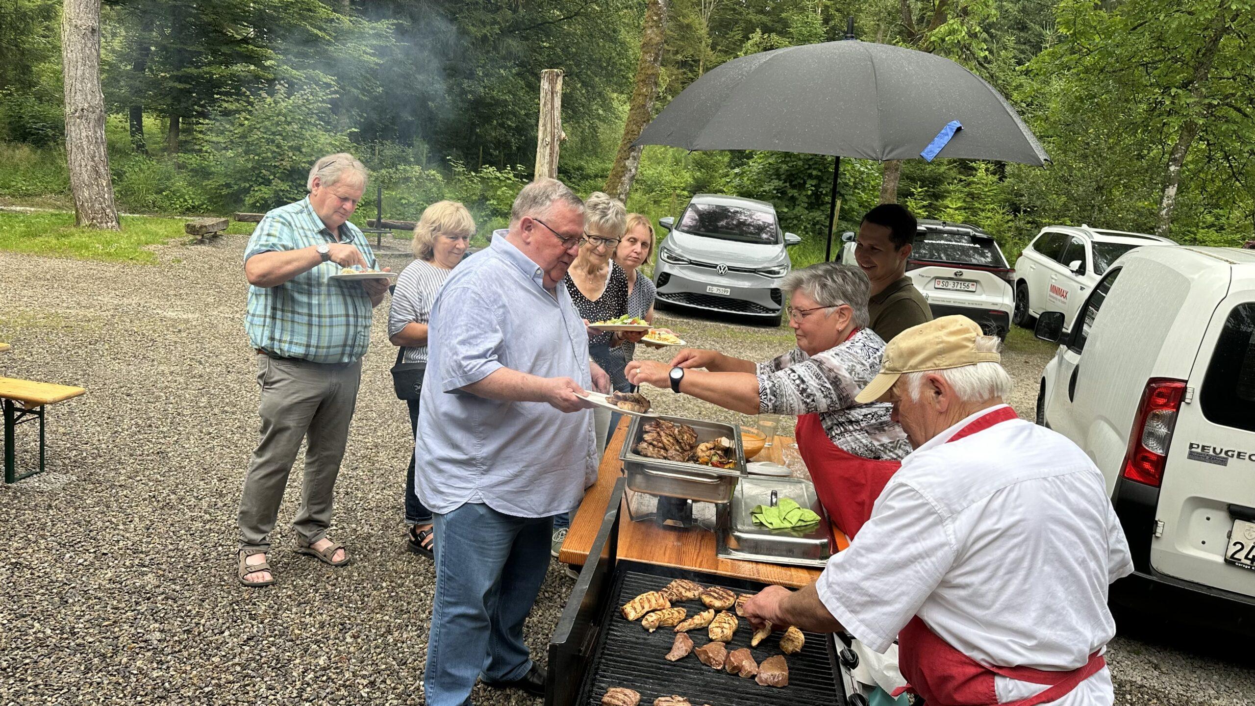 In diesem Jahr war turnusgemäss der Grillabend wieder im Waldhaus Riken. 25 Personen folgten der Einladung des HGV zum gemeinsamen Bräteln und gemütlichen Beisammensein, obwohl das Wetter nicht optimal war. So kam es, dass genau als die Grilladen bereit waren, es anfing zu regnen. Die Gäste konnten trocken im Waldhaus essen, die Grillmeister Heidi und Heinz Zaugg standen jedoch im Regen. Raphael Sidler übernahm daraufhin den Schirm und gab alles, damit die beiden nicht vollends im Regen standen. Kaum war das Essen vorbei, konnte auch schon wieder draussen Platz genommen werden, wo noch bis in die späten Abendstunden spannende Gespräche stattfanden.
